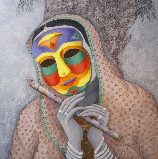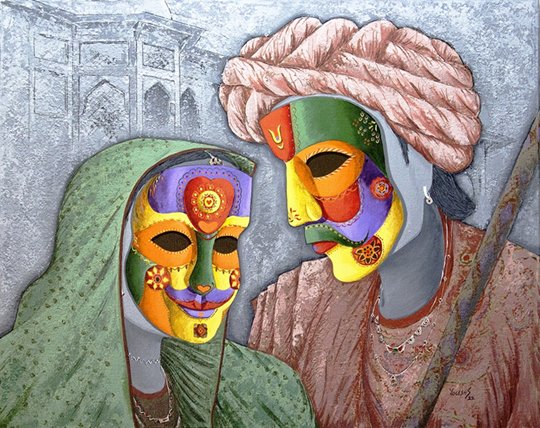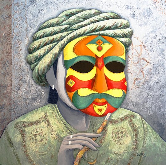 He has aesthetically and adorned his works showing vivid masks to reveal different feelings in human mind like happiness, curiosity, excitement, innocence, dejection, enthusiasm, pangs of separation, sadness, gloom, masculinity, dominance, anger, hatred, femininity and many more. He has shown these iconic motifs on the faces of the living creatures that resemble human beings, animals, birds and all alike. These depict intense vulnerability and intention of human beings to hide their real personality and mindscape by putting up the various masks in order to safeguard themselves from different catastrophes or unpleasant/problematic situations and happenings in their life. He has tried to show the anatomical features showing various moods of the character as well as characteristics and peculiarities of their inner feelings in apt perspectives.  He has artistically shown various designs of masks put up by human beings on their faces for security, privacy, pride, ego, vanity, respect, fun and many more. He has created the desired visual effects in his work by using various layers of apt colours and his skilful technique using palette knife and other means in order to adorn them with the expected sentimental mindscapes of the character in the requisite perspectives of visual arts.