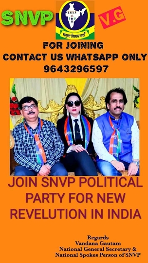 Ms Vandana Gautam is the Present first Woman National General Secretary and National Spokes Person of Sanyukt Vikas Party (SNVP) in India.This is the landmark in the Sanyukt Vikas Party when a woman becomes the National General Secretary and National Spokes Person of Sanyukt Vikas Party (SNVP).