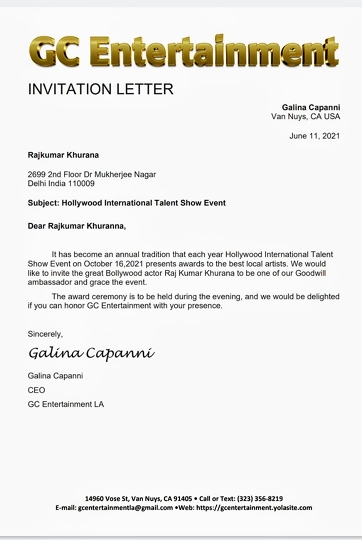 Bollywood actor Rajkumar Khurana has been invited by GC Entertainment CEO Galina Kappani as a special guest for the event to be held on 16 October2021. Galina Kappani honored Rajkumar Khurana in the Hollywood International Talent Show with the Best Actor Award.