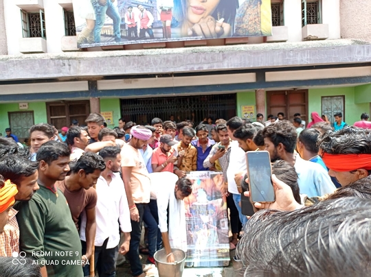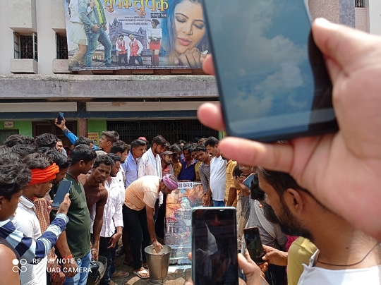 The poster of Bhojpuri’s Rajinikanth Hit Machine Khesari Lal Yadav’s Chori Chori Chupke Chupke was showered by the fans with milk