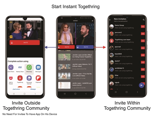 The App helps everyone to connect more closely despite being in different locations or parts of the world. Togethering is different from any of the existing social media platforms such as WhatsApp, Instagram, Snapchat, Facebook, YouTube, Zoom, etc. It offers all the features of these apps in one single platform along with co-viewing or perform co-activities online.