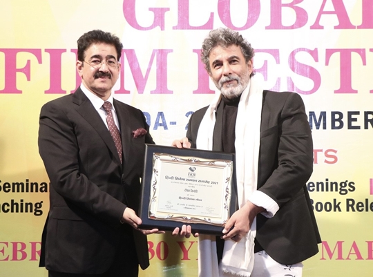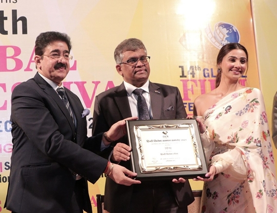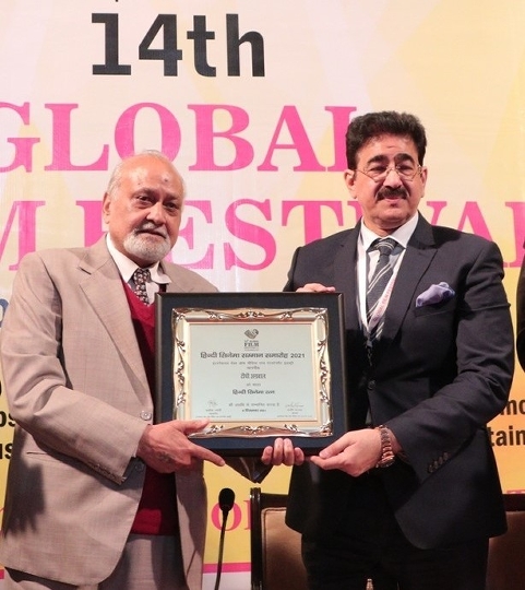 Noida: The highest and the most prestigious award of Hindi Cinema this time was presented to film Producer T.P.Agarwal the designated President of Film Federation of India and President of Indian Motion Picture Producers Association for fifteen years for his untiring services to Indian Film Industry by internationally renowned media personality Dr. Sandeep Marwah Chairman Hindi Cinema Samman Samiti, Chancellor of AAFT University of Media and Arts and Chairman M&E Committee BIS Ministry of Consumer Affairs, Government of India at the fifth edition in a grand event of 14th Global Film Festival Noida 2021.