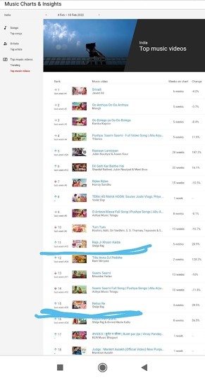 इंडिया टॉप म्यूजिक वीडियोज में नंबर 1 पर पुष्पा फिल्म का श्रीवल्ली, नंबर 2 और 3 पर ओ आथिया, 4 पर सम्मी जैसे गाने के बीच में भोजपुरी इंडस्ट्री के भी गानों ने इस चार्ट बास्टर में अपनी जगह में वृद्धि करते हुए आगे बढ़ रहे हैं। जहाँ पिछले सप्ताह ‘राजा जी खून कई द’ 15वे नंबर पर था, वही इस सप्ताह इस सांग ने चार पायदान की बढ़त बढ़ाते हुए ये 11वे नंबर पर आ गया है। वही इसी के साथ ‘रेलिया रे’ सांग भी छलांग लगते हुए 25वे स्थान से 15वे स्थान पर आ गया हैं। इन दोनों ही सांग में एक खास बात है कि दोनों ही गानों को भोजपुरी इंडस्ट्री की सबसे भरोसेमंद म्यूजिक कंपनी वर्ल्डवाइड रिकार्ड्स भोजपुरी ने रिलीज किया है और दोनों ही गानों को भोजपुरी की ट्रेंडिंग सिंगर शिल्पी राज ने गाया हैं। जहाँ ‘राजा जी खून कई द’ में ट्रेंडिंग गर्ल नीलम गिरी ने अपनी परफॉर्मस से चार चांद लगा दिके हैं, तो वही ‘रेलिया रे’ में अभिनेत्री श्वेता महारा नजर आई हैं। वर्ल्डवाइड रिकार्ड्स भोजपुरी से रिलीज ‘राजा जी खून कई द’ 37 मिलियन और 3 लाख 5 हजार लाइक वही, ‘रेलिया रे’ को 23 मिलियन और 2 लाख 31 हजार से ज्यादा लाइक हासिल कर चुके हैं।