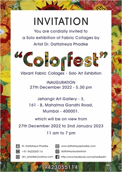 A solo art exhibition of vibrant fabric collages by  contemporary artist Dr.Dattatreya Phadke is showing in Jehangir Art Gallery, M.G. Road, Kala Ghoda, Mumbai 400 001 from 27th December, 2022 to 2nd January, 2023 between 11 am. to 7 pm.