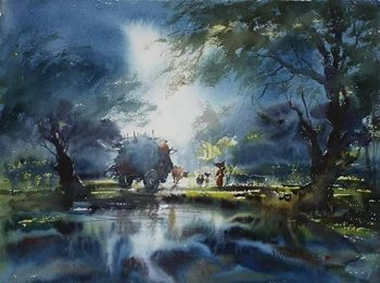 Vitthal Hire :-His thematic works in water color on paper reveal the proficiency in and command over the medium and technique used for the aesthetic adornment of the various works with the desired visual perspectives. He has mostly emphasized the life style and struggle of various people in their life in rural environments, the sanctity of different festivals, the relevance of such celebrations in life, important vignettes of culture and heritage in rural and urban areas, beauty of nature and its numerous wonders and vivid religious fairs and their relevance in human life. His works being lucid and eloquent often receive overwhelming public response and appreciation from the present art world due to relevance of our heritage, religious glory and eternal spiritual fervor as well as apt color harmony and rhythm of the colors used for their artistic adornment with the desired visual aspects of eternity and divinity.