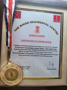पटना : देश के जाने माने फिजियोथेरेपिस्ट व साईं हेल्थ केयर वेलनेस सेंटर पटना के निदेशक डॉ राजीव कुमार सिंह को चिकित्सा के क्षेत्र में उनके द्वारा किये गए उत्कृष्ट कार्यो के लिए बिहार रेजिमेंट सेंटर द्वारा स्वर्ण पदक से सम्मानित किया गया। डॉ राजीव को ये सम्मान बिहार रेजिमेंट सेंटर दानापुर में विश्व फिजियोथेरेपी दिवस के अवसर पर आयोजित एक भव्य समारोह के दौरान दिया गया। इस सम्मान उन्हें बिहार रेजीमेंट सेंटर दानापुर के सेंटर हेड ब्रिगेडियर जसपाल के हाथों फिजियोथेरेपी चिकित्सा के क्षेत्र में बेहतर कार्य करने के लिए मिला।