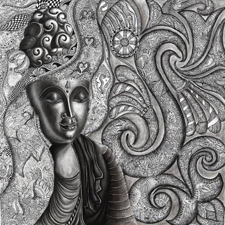 His upcoming solo exhibition, ‘Triparna: The Trinity of Art,’ at the Nehru Centre, Mumbai, exemplifies this unique synergy, offering a visual journey that seamlessly fuses these diverse traditions and popular cultural practices. Each painting invites the viewer into a world of personal religious and spiritual exploration, where Sarang deftly balances the intricate with the ethereal. Central to this collection are his works, which are based on Buddhist sculptures from around the world, starting from the historic Ajanta and Ellora cave art, as well as works from other regions where Buddhism has profoundly shaped culture, religion and philosophy.